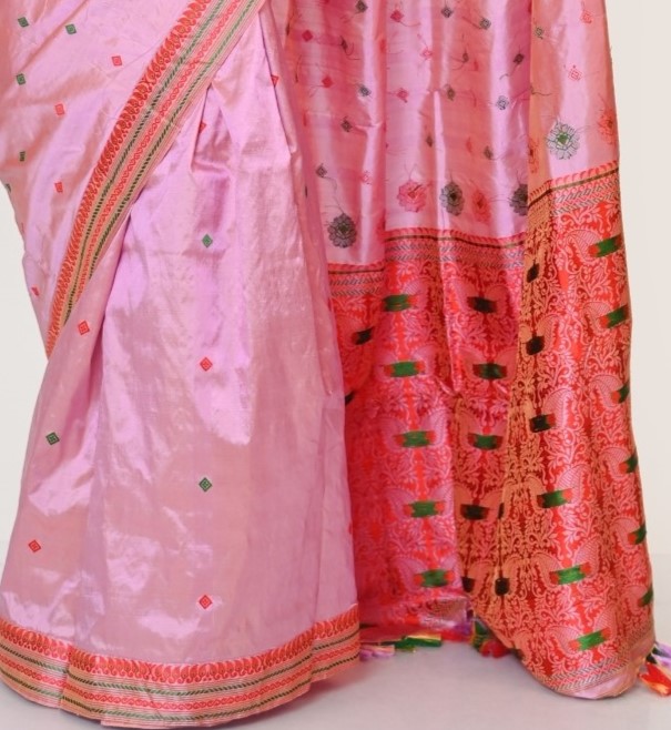 Pat silk or White pat silk, Mulberry silk of Assam is derived from silk worms that live on mulberry trees and is also known as Mulberry Silk or “Nuni pat” in Assamese. This type of silk has a distinctive white and off-white colour and is known for its brightness, high quality, softness, durability, and glossy texture. Apart from the natural white pat silk is also available in dyed colours.
